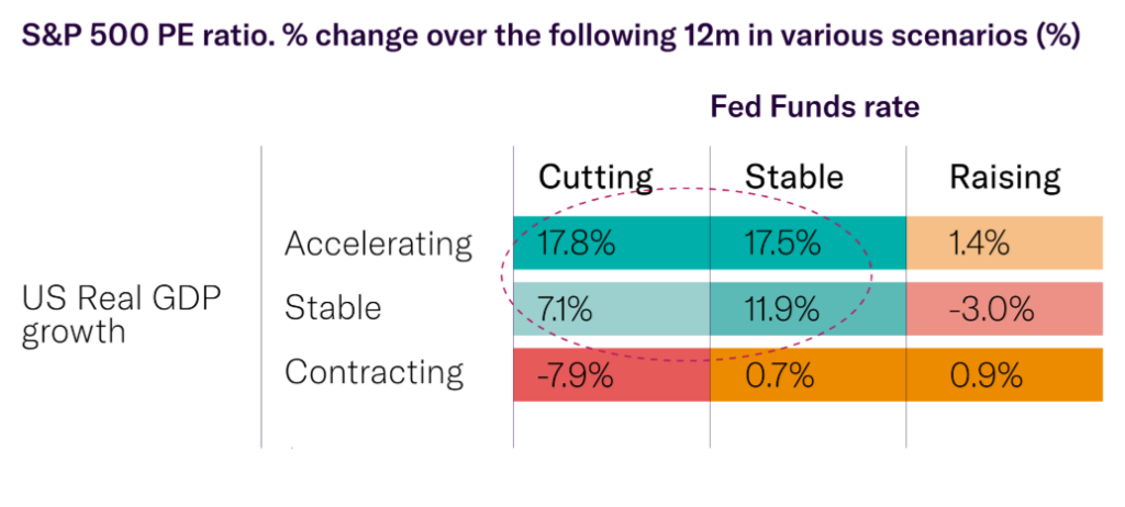 This compares to less favourable environments that show weaker effects. When growth is contracting and the Fed is raising interest rates, PE ratios have risen by only around 0.9%1. The most challenging scenario occurs when the Fed cuts rates because growth is deteriorating, a situation markets often interpret as policy makers falling behind the curve. In these cases, PE ratios have historically fallen by as much as 8%.1