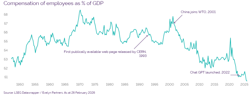 However, a recent Minneapolis Fed study challenges this idea.2 The authors argue that when labour’s share of income falls and free cash flow rises, as has been the trend for decades, valuation multiples can rise and stay elevated. This pattern aligns with long term structural shifts, including the growth of the internet, China’s entry into the World Trade Organization, widespread offshoring, automation and now generative AI. All have weakened labour’s pricing power and pushed labour compensation as a share of GDP to historic lows.